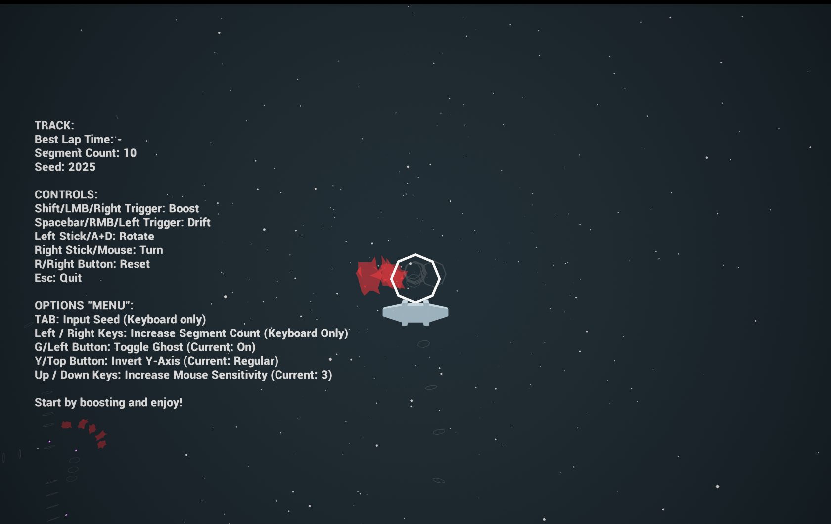 This is a simple flying race game for the 2025 GMTK game jam. It's not the most creative, but you can enjoy racing against yourself on an infinite number of procedurally generated tracks - complete with ghost data to continue to try and beat your own high scores.